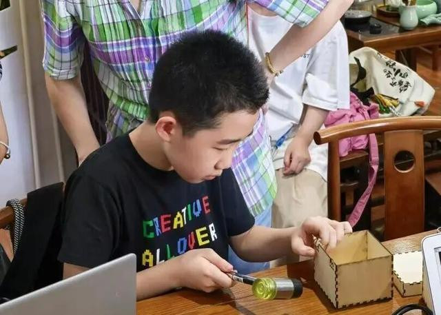 学员们在老师的带领下纷纷化身“小小木工”——大家拿着小锤子、仔细比对组件,轻轻敲打、小心翼翼拼接组装。没过多久,一个个初具雏形的木质收纳盒就在孩子们手中诞生。